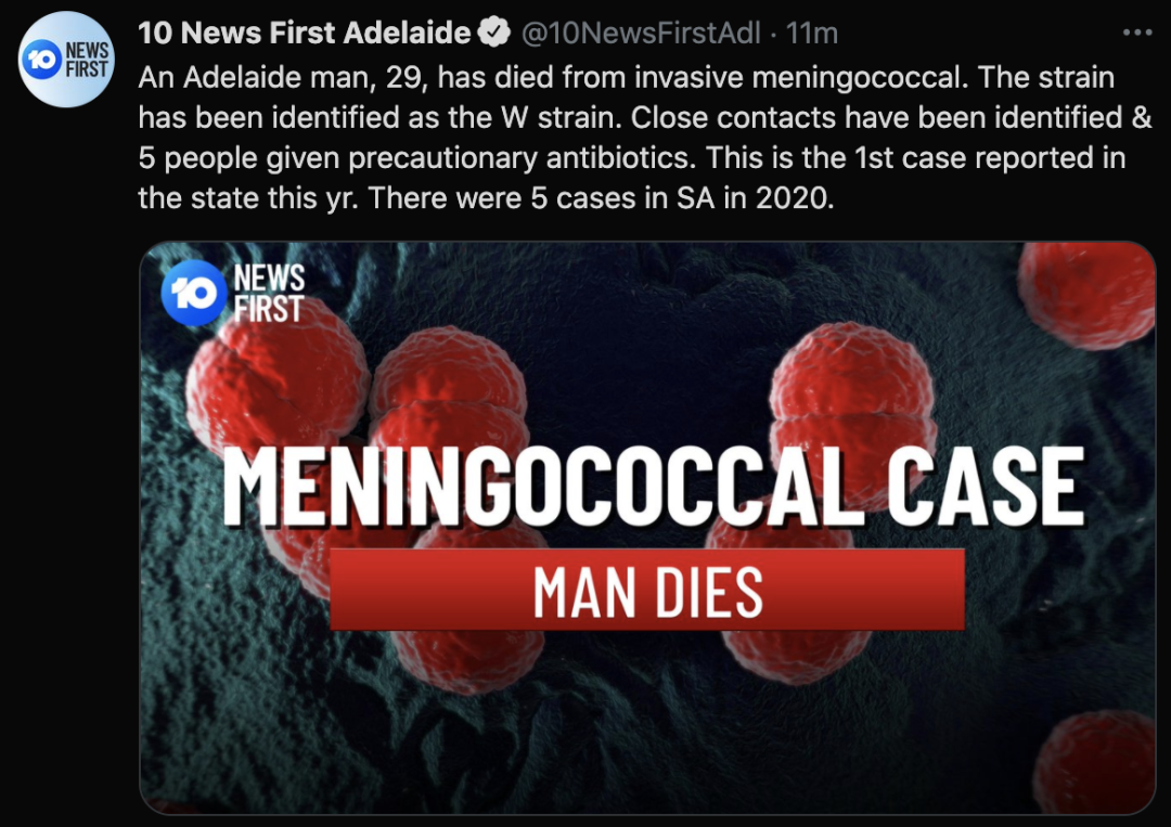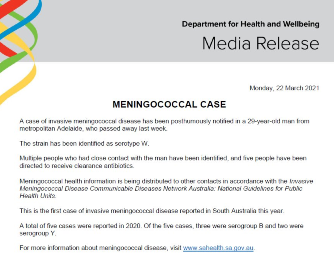 标题: 南澳29岁男子感染脑膜炎球菌后死亡,5名密切接触者接受抗生素治疗!