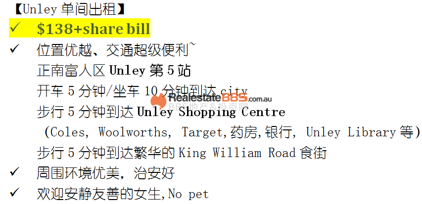 【单房出租】 正南富人区Unley4-5号站之间, 5分钟步行到超市和车站,10分钟公交到city, 138+share bill,欢迎安静友善的女生。 有意向者请加微信。