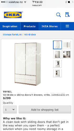 宜家衣柜,刚购买不久,几乎全新。原价299,先半价出售150。已拆装,喜欢的朋友欢迎联系0468751915。谢谢