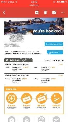 140刀可议价转一张9月18日出发,9月25日返程的阿德往返悉尼机票,时间非常好,11点出发,下午3点返回,联系电话:0481797667,非诚勿扰谢谢 微信:Zch_212