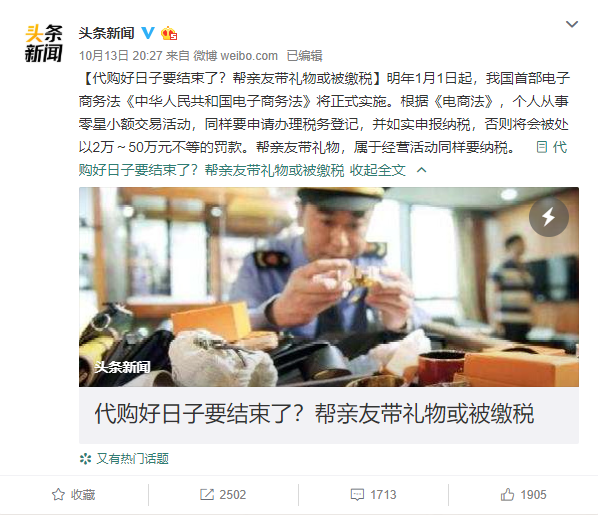 今年8月底中国电商法正式通过,将于2019年1月1日起开始施行, 这对代购来说可是有非常大的影响… 当时还有一部分人抱着侥幸心理,这个内容看起来是说那些在平台上开店的, 应该普通微信上代代购,平时回国的 ...