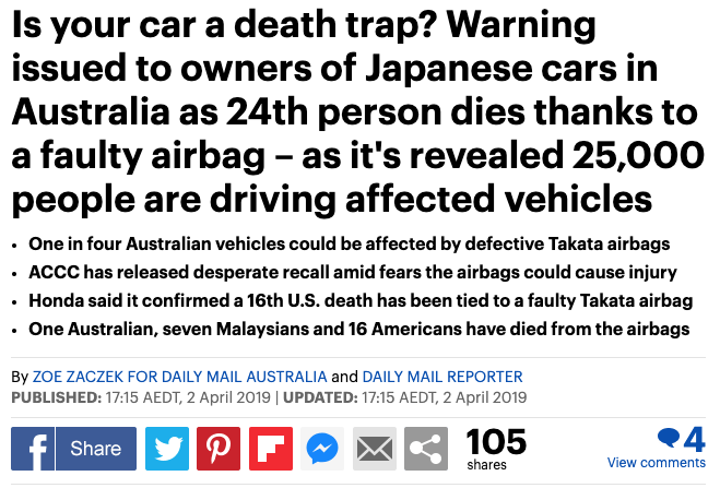 注意!澳洲有四分之一的汽车可能都受到了Takata安全气囊的负面影响! 据悉,全球有1亿辆配备了Takata安全气囊的汽车需要召回。