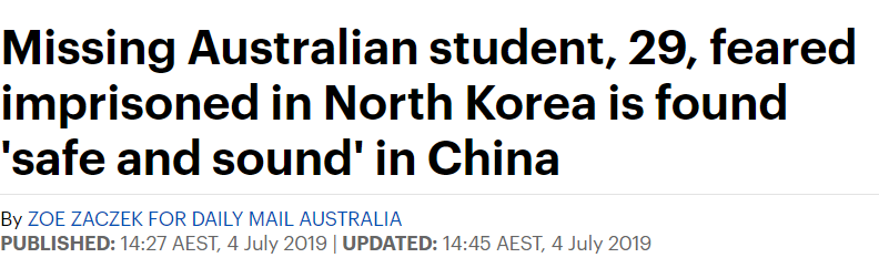 中澳混血留学生被监禁在朝鲜的新闻, 前不久获得广泛关注。 不过,目前该男子被发现在中国并且“安然无恙”。 据报道,他目前正前往日本东京。 澳洲总理莫里森在下午2点30分左右在议会证实了这一消息。 ...