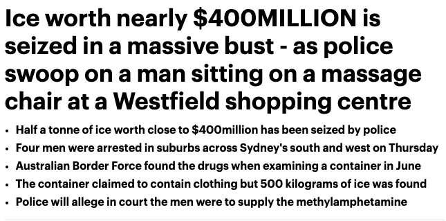近日,澳洲警方在行动中缴获了价值近4亿澳元的半吨冰毒,并且逮捕了四名男子。 2018年,来自新州警察犯罪小组、澳洲刑事情报委员会、新州犯罪委员会和西澳警察部队的侦探们成立了一支严打队伍,调查一个涉 ...