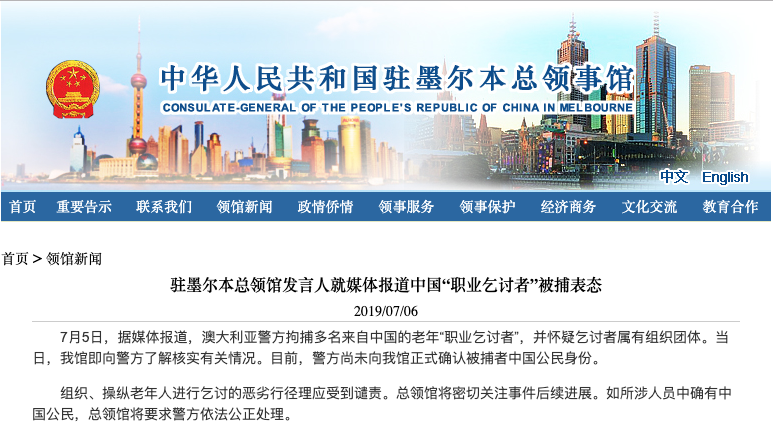 针对澳媒报道的澳洲街头的“有组织华人职业乞讨者”, 中国驻墨尔本领事馆终于表态了! 相关新闻: 澳媒刷屏:“中国大妈乞丐团”街头被捕!日赚千元全寄回国!获释后仍继续乞讨!要求帮买机票! 日赚$4 ...