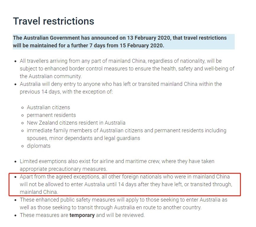 澳洲总理莫里森昨天下午(2月13日)宣布禁令延长一周,一周后再审核。 而今天,移民局根据政策变化和事态发展,又静悄悄的在其官网更新了相关说明。 这次政策说明非常直接明了,再三强调了“过去14天在中国 ...