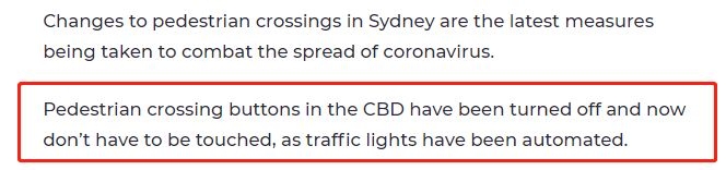 据7News 报道,在疫情期间,为了减缓新冠病毒的传播,悉尼的行人信号灯已经实现自动化,现在无需触摸。 “如果您在CBD需要过马路,请不要触碰按钮,只需等待绿色信号灯即可通行。”
