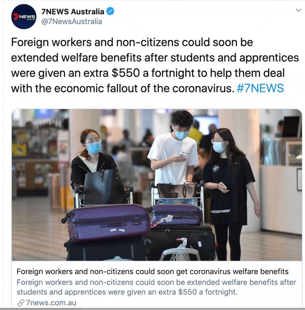 近期,澳大利亚宣布在每两周给学生和学徒550元的补偿费用, 以帮助他们应对冠状病毒的经济影响,外国劳工和非公民可能会很快就会获得同等福利。 她说:“尽管从长远来看,我们需要更多的更多的措施,但每 ...