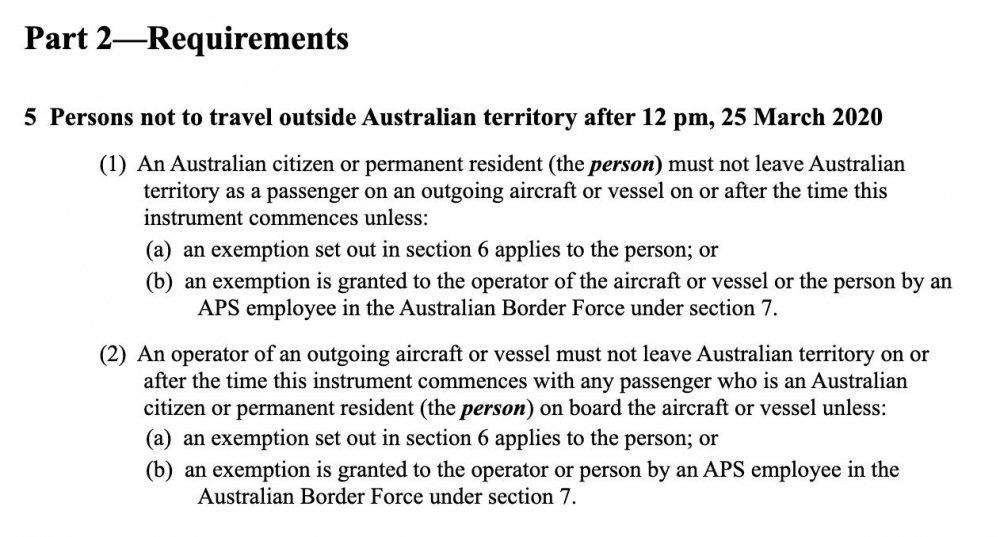 根据卫生部长Greg Hunt最新发布的立法文件,所有PR和澳洲公民从今天中午12点开始均不得离开澳洲,乘飞机或坐船均不被允许。
