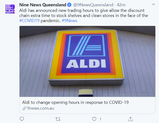 Aldi宣布将对其营业时间进行调整。 该公司表示,将“每周对新的营业时间进行评估,决定是否保持对营业时间的更改还是恢复正常营业时间”。