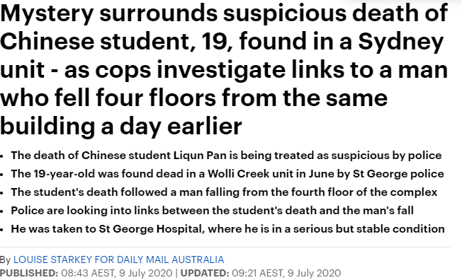 6月28日,在悉尼Wollis Creek的一栋公寓楼里,一位华人女生Liqun Pan坠楼身亡,年仅19岁。目前该案正在调查之中。据警方消息,该女生的死因被作为可疑案件处理,并可能与案发前一日的另一起坠楼事件有关。 警 ...