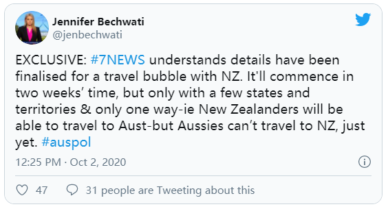澳媒报道,澳新两国旅游豁免规定Travel Bubble的细节已经敲定。主要包括以下几点: 10月16日起,澳洲重开对新西兰边境。 起始阶段,仅允许新西兰人无需强制隔离前往新州和北领地。 起始阶段旅行豁免是单向的, ...