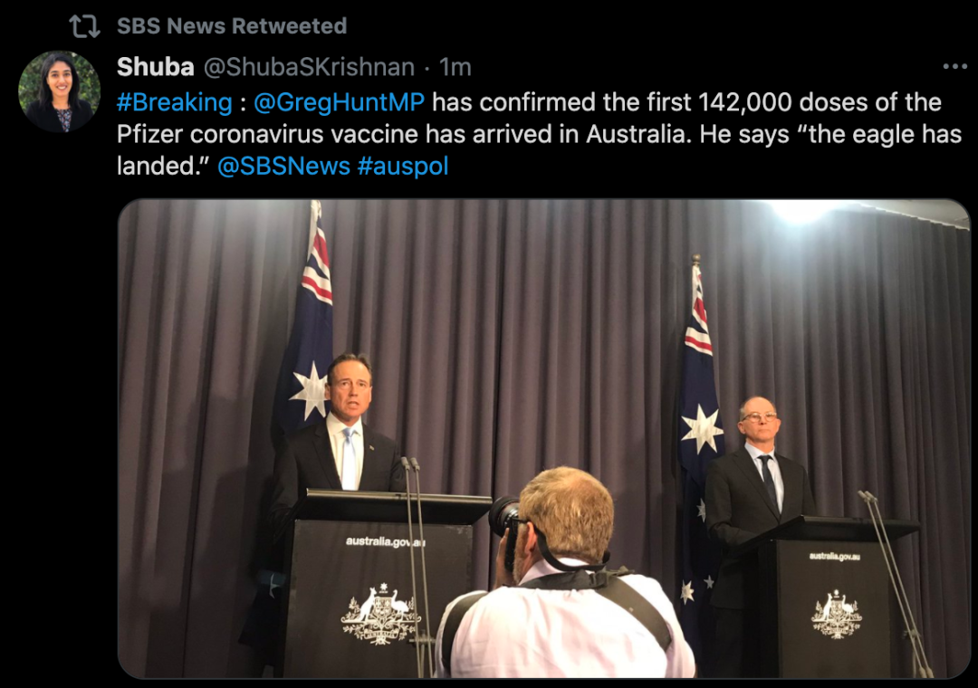 突发! 联邦政府证实,第一批14.2万剂辉瑞疫苗刚刚抵达悉尼机场,疫苗接种将于下周一(2月22日)开始! 下周将发放8万剂疫苗,其中5万剂将分发给酒店检疫人员、边境工作人员以及一线医疗工作者;剩下的3万剂疫苗 ...
