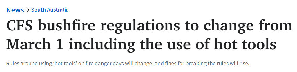 据澳媒报道,南澳CFS丛林火法规将于3月1日起改变,包括使用热工具的限制规定。 它说,南澳持续的降雨不足增加了整体的丛林大火威胁。 他说:“这种危险情况与秋季通常所经历的情况一致,其特点是火警危险 ...