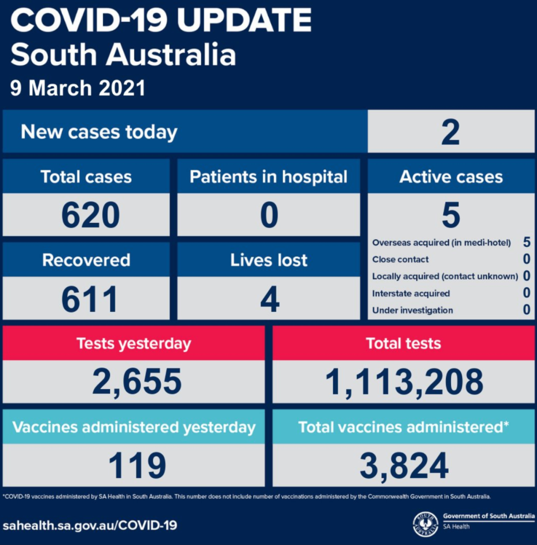 在过去的24小时内,南澳新增2例海外输入病例。 目前南澳有5个活跃病例,已进行了1113208次病毒检测,已为3824人接种了疫苗。 文章来源:网络综合报道