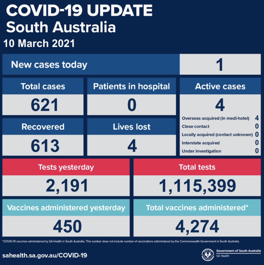 在过去的24小时内,南澳新增1例海外输入病例。 目前南澳有1个活跃病例,已进行了1115399次病毒检测,为4274人接种了疫苗。 早些时候,副首席医疗官Nick Coatsworth接种了阿斯利康疫苗。 在接种疫苗后,他说 ...
