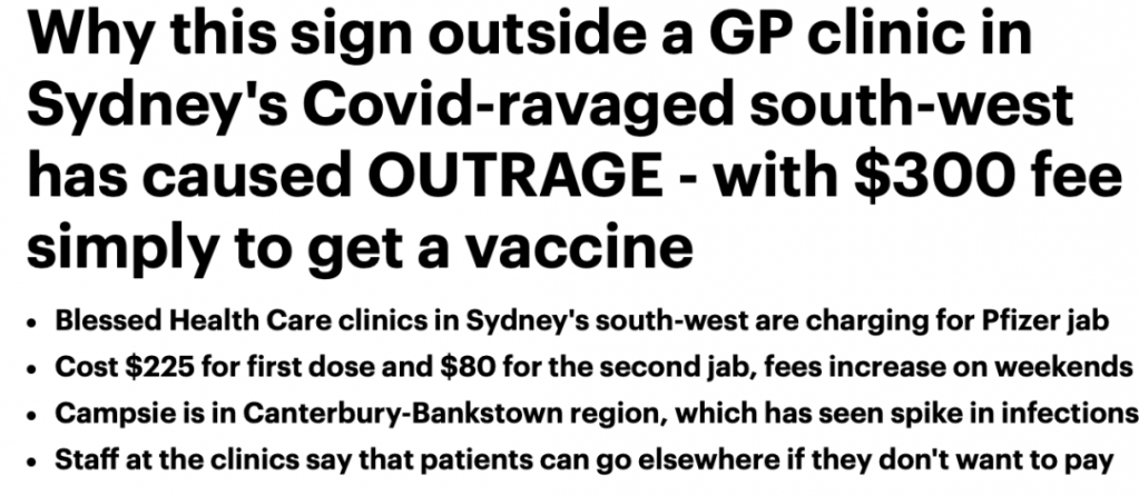 悉尼疫情最严重的地区之一的一家GP诊所因向患者收取Covid-19疫苗费用而引发了社区的愤怒。 该部门的网页上说,病人接受疫苗接种的咨询预约是免费的。 Blessed Care's Anglo Street诊所的一名护士Jacob Chen说 ...