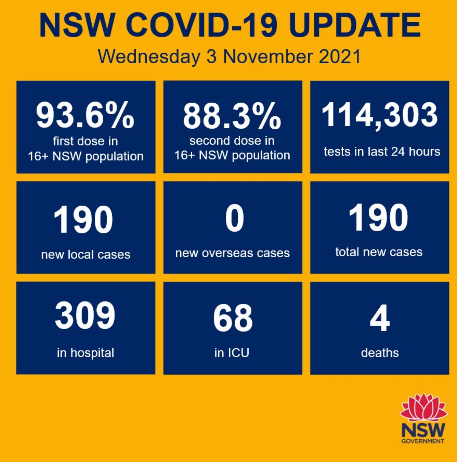 新南威尔士州记录了190例新增本土COVID-19病例,并有4人死亡,AMA赞同推迟对未接种疫苗者解除限制的计划,而其他人将在下周享受新的自由。 新的病例是在周二晚上8点前的24小时内从114,303个测试中记录的,比前一 ...