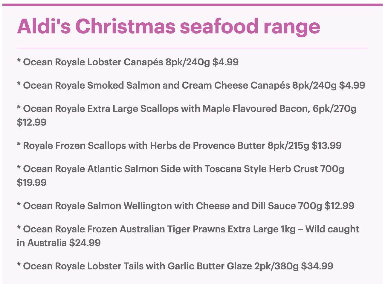 Aldi将推出备受人们期待的“圣诞海鲜”系列产品,其中包括龙虾和三文鱼,价格低至4.99澳元。 “今年,我们还扩大了季节性海鲜的范围,包括澳大利亚大虾和龙虾小菜等新产品,我们认为顾客一定会喜欢。” “ ...