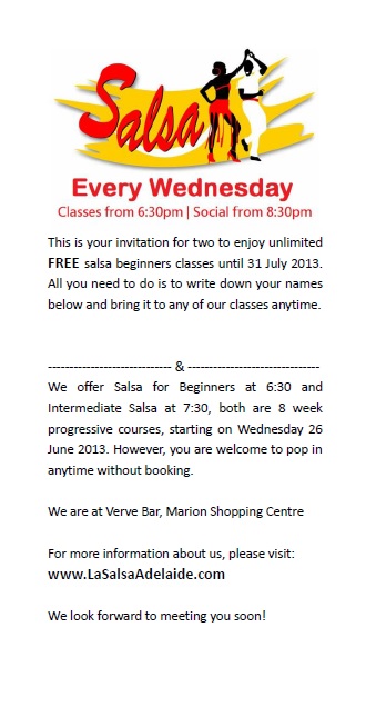 This is your invitation for two to enjoy unlimited FREE salsa beginners classes until 31 July 2013. All you need to do is to print this invitation, write down your names and bring it to any of our cla ...