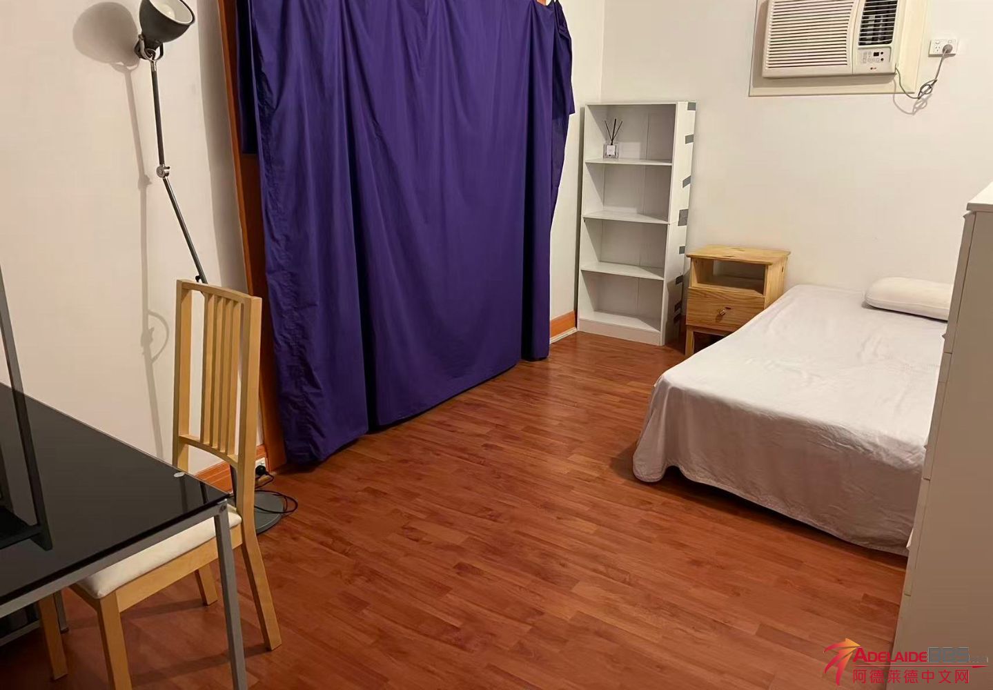 你的房间有大衣柜,单人床,小桌和台灯,窗外有阳光绿植,需要和一个女生share洗手间