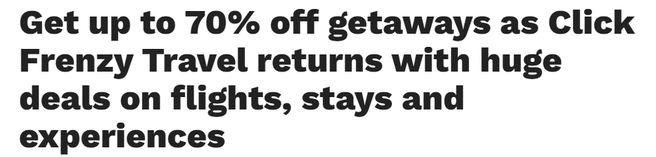 Click Frenzy Travel将于今天,即3月25日星期三澳大利亚中部夏令时间下午6:30回归,活动仅持续四天,至3月29日星期日午夜结束。这场限时促销活动涵盖机票、住宿、旅行团、体验项目和旅行装备的独家优惠。