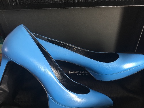 全新正品高跟鞋,防水台2cm后高跟8cm, 官网九百多购买了粉色蓝色,蓝色因为断码所以买小了一号现$650转让。37码不偏码。 YSL的高跟鞋走路完全不累脚噢。 喜欢的加QQ153116881.