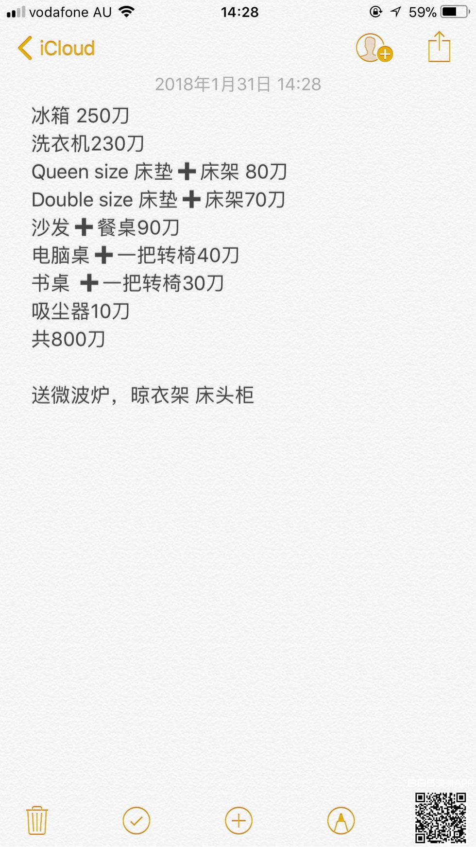 两室全套家具,281gouger street 2月中上旬可以取 请上门自提,没有车不能送抱歉。 有兴趣请加微信号842056017或扫描二维码看图片 或上门查看物品,非诚勿扰,谢谢