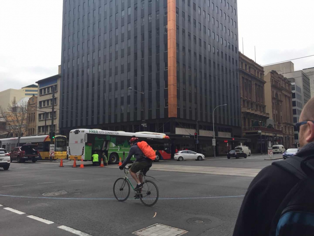 突发! 今早九点刚过, 一辆Bus行驶到Currie Street和King William Street交叉的十字路口时, 突然坏掉了! 在此特别感谢热心市民Dong先生和Amy提供的现场图片。