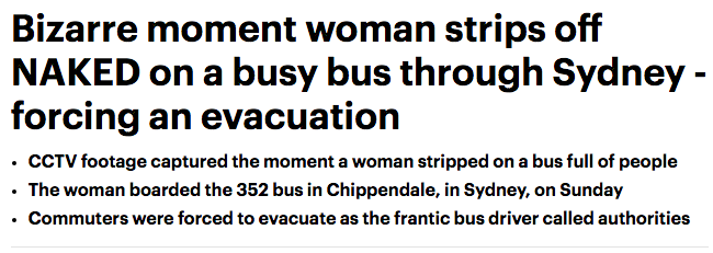 一名女子在公交车上把自己脱光, 这让司机和其他乘客如何是好! 这辆公交车不得不停止运行。车上的乘客被迫疏散,他们纷纷带着随身物品下了车。 然后,这名裸女又跑到公交车前面,对着司机咆哮,而司机正在 ...