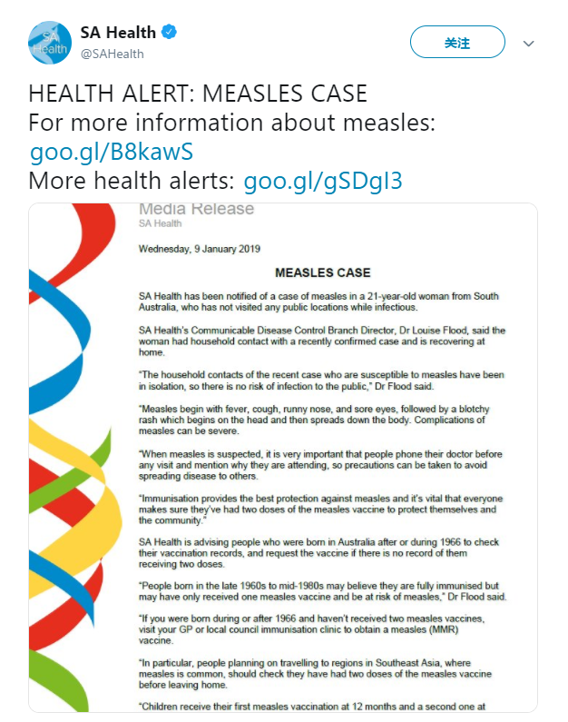 今天,SA Health发布麻疹预警,确认,南澳已有一名21岁的女性感染麻疹。 但该名病患在感染期间并未到过任何公共场所。 来源: SA Health
