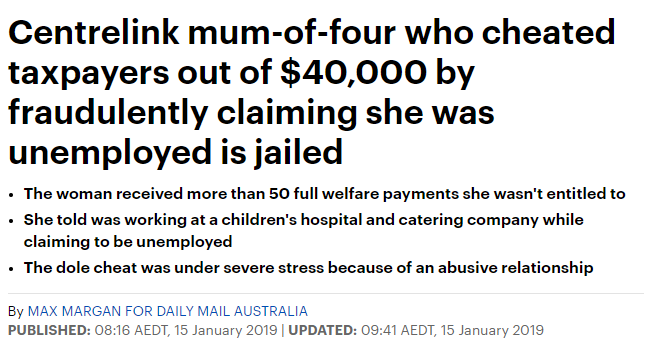 澳洲一名4个孩子的妈妈谎称自己失业骗取了大量Centrelink福利金,目前已被判入狱,还要向Centrelink“还债”...... 最后,这名女子将被处以10个月的监禁,包括5个月的非假释期,并须每周给Centrelink90澳元。主法官 ...