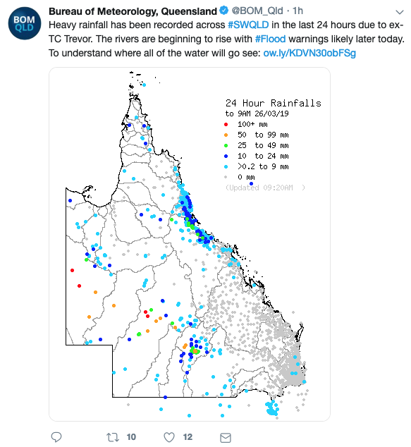 旋风Trevor最近搅乱了整个澳洲! 在未来几天,这个旋风又将席卷昆士兰地区, 据气象局预警,最早将于明天从北领地海岸线进入昆州。 目前,昆士兰西部的Gulf Country,Channel Country,Central West以及Warre ...