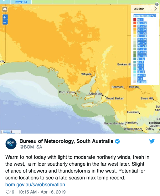 今天, 阿德莱德的气温突然飙升! 天干物燥,大家务必注意用火安全! 复活节有出行计划的各位,如果在不熟悉的地区旅行,也请注意当地火灾预警和用火规定!
