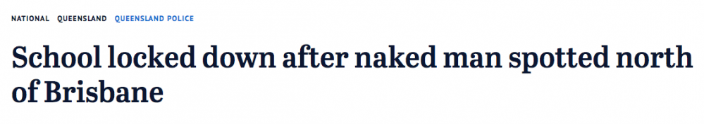 今天早上,警方出动,将布里斯班北部的一所高中紧急封锁! 封锁状态持续了大约40分钟左右! 为了找出一名出现在该地区的裸体男子! 上午9点40分左右,警方宣布,解除封锁。 真是世界之 ...