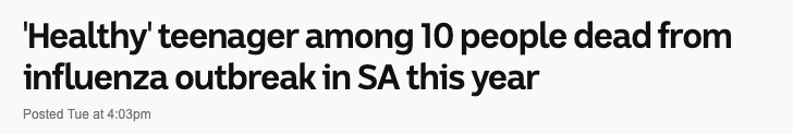 今年,南澳有10人死于爆发的流感,包括一名15岁的青少年。 孕妇(无论处于哪个孕期);65岁及以上的人士;6个月-5岁之间的原住民及托雷斯海峡岛民;15岁及以上的原住民及托雷斯海峡岛民;6个月以上且患上严重 ...