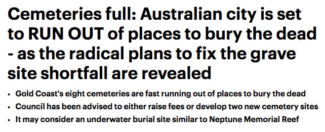 黄金海岸有计划将墓地建在海底? 据报道,黄金海岸现有的8个墓地几乎全都满了, 水下墓园的确能减少占用地上空间,但是潜水祭拜亲人恐怕不是每个人都能做到的。