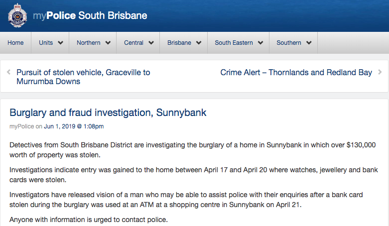 布里斯班Sunnybank发生一起入室盗窃案, 警方呼吁民众协助,提供相关信息。 据报道,4月17日至4月20日之间,发生入室盗窃, 嫌犯进入一所住宅偷走手表,珠宝及银行卡等财物。 被盗的银行卡曾在4月21 ...