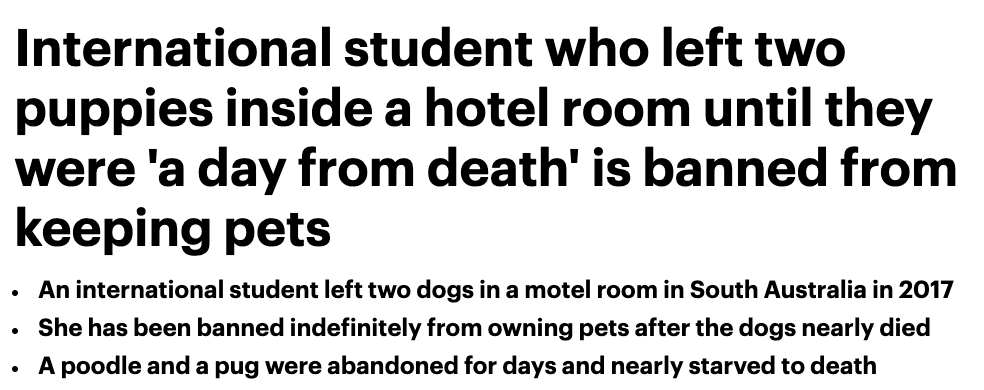 饲养宠物很需要责任心, 一中国留学生将两只狗留在汽车旅馆,狗狗差点饿死。 这名留学生也因此被无限期禁养宠物。 南澳皇家防止虐待动物协会(RSPCA)的工作人员一直在寻找两只狗的主人, 最后 ...