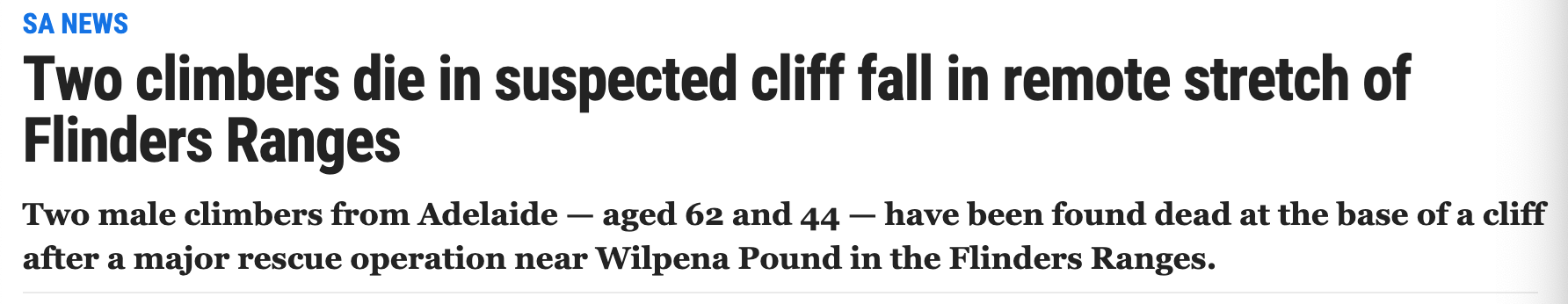 Flinders Ranges偏远地区的悬崖底部发现两名登山者尸体。 然而,登山者坠崖在这里已不是初次发生了, 2014年4月,一名登山者从Moonarie的一个偏僻高50米的悬崖坠落后死亡。 提醒大家,野营登山等户外运动 ...