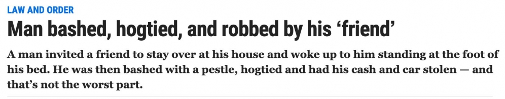 好心收留朋友,却没想到遭到对方殴打,被绑,被对方在身上撒尿,最后还把自己的车偷走了。如此塑料朋友实在罕见。 受害者醒来时,发现Suter在床脚边。“当受害者脸朝下躺着的时候,Suter跨坐在他身上,朝 ...