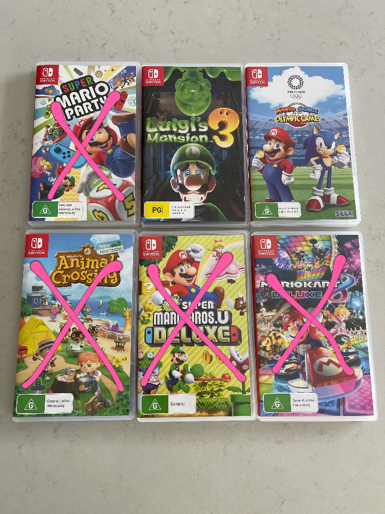 游戏闲置,55刀/张 还剩路易吉洋楼3 & 马里奥东京奥运会 短信联系:0405 217 675