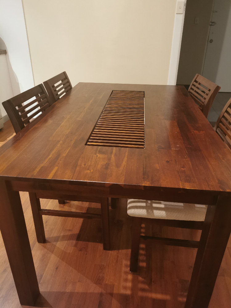 1x木质餐座 (760h x 1500w x 900D) +8个木质椅子 (880H x 450W x 500D) 桌子的脚下有些瑕疵如图。 $250. 不议价,非诚勿扰,谢谢。 微信联系: Ching1108