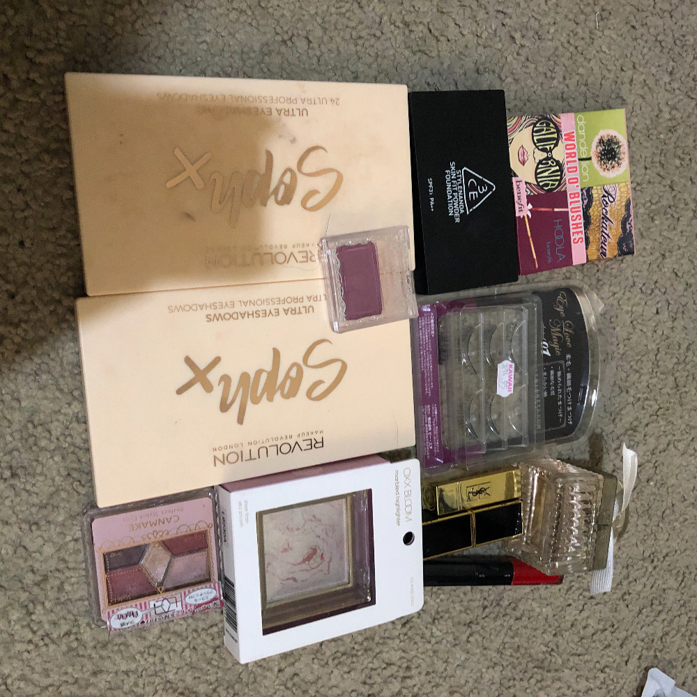 chloe香水$50 sophx 眼影$8 Canmake眼影$8 oxx bloom rose gold高光$3 假睫毛可配胶$8 3CE light ivory粉饼$20 world’s hoola 腮红$13 Canmake 腮红$5 ysl小样01$3 tf 44 sunset blvd口红$15 L’Oréal 口红$3
