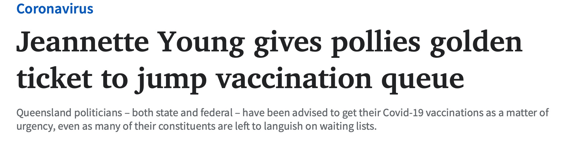 尽管一线工人和优先群体中的弱势昆士兰人仍在等待接种疫苗,昆州首席卫生官Jeannette Young博士允许昆士兰政客们插队接种珍贵的辉瑞公司疫苗。 这封信被昆士兰护士专业协会和昆士兰教师专业协会抨击为 "令 ...