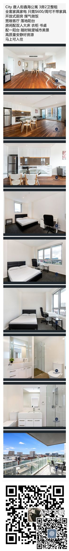 City 唐人街鑫海公寓 3房2卫整租 全套家具家电 只需$600/周可不带家具 开放式厨房 煤气做饭 宽敞客厅 落地阳台 房间配双人大床 衣柜 书桌 配一阳台 随时眺望城市美景 高质量安静好房源 马上可入住 联系微信 ...