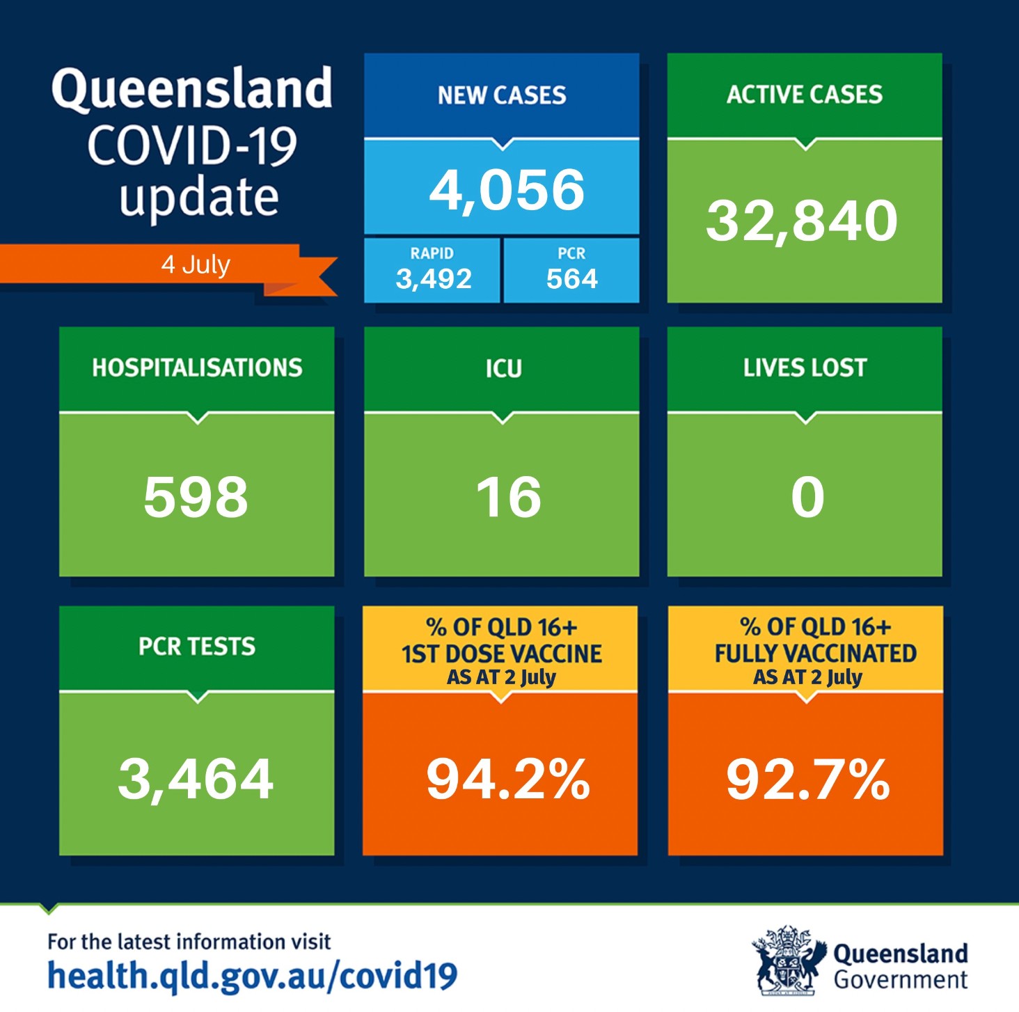 在过去24小时里,昆州新增4056例,无人死亡。 其中PCR检测564例,快速检测3492例。 目前全州活跃病例为32840例。 共有598人因covid住院,16人住在重症监护室。 全州16岁以上人群两针接种率为92.7%。 图文 ...