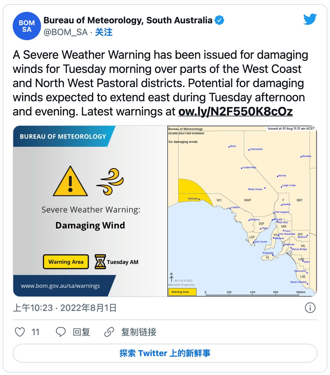 随着一系列雨带袭来,气象局已向南澳多地发出恶劣天气警告。 他说:“工作日的大部分时间都会刮风,有时会有降雨。” 周二,阿德莱德将有高达10毫米的降雨,本周其余时间也将有降雨,周四的降雨量为8毫 ...