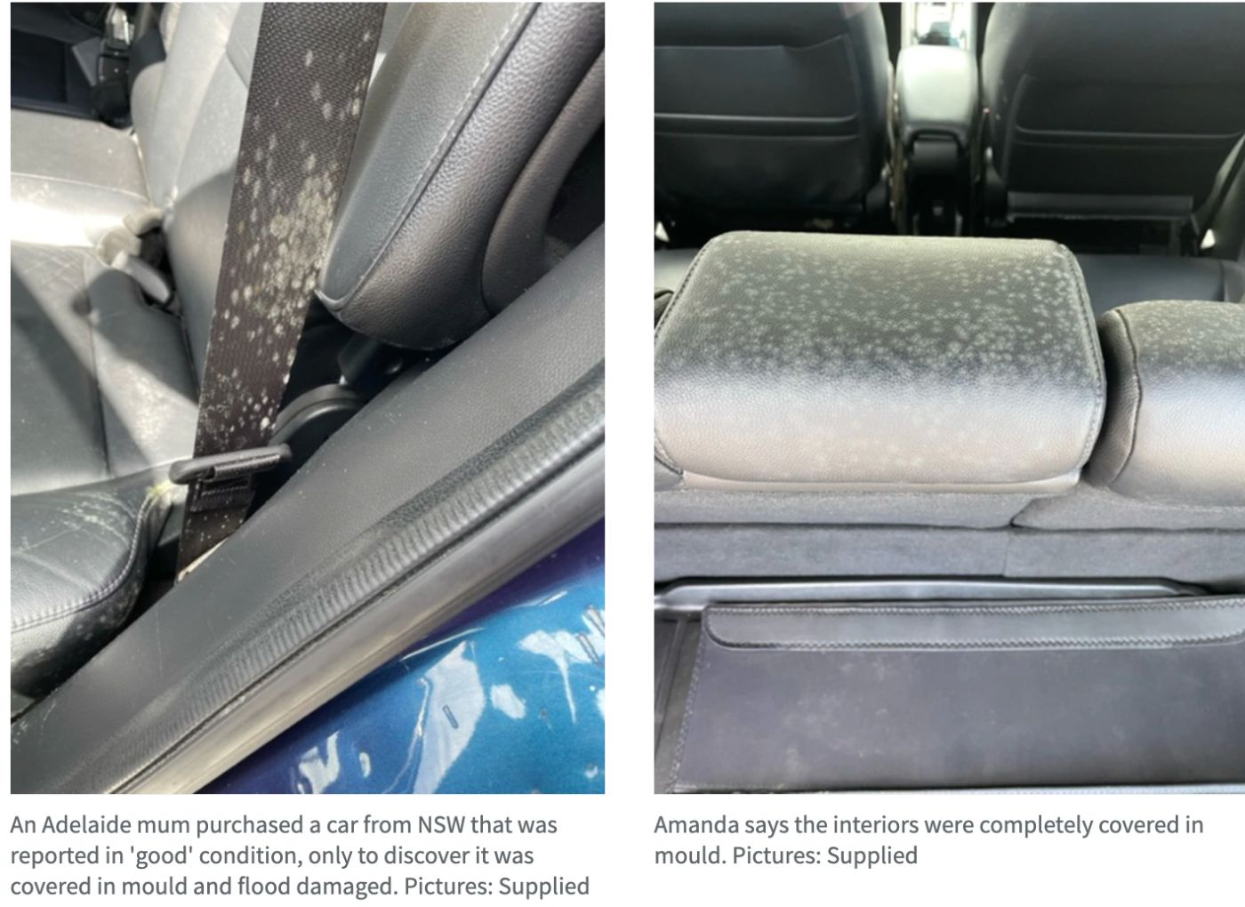 阿德莱德一位母亲从新州购买了一辆“状况良好”的二手车,却发现车内都是霉菌,她警告买家要当心。 但是,汽车到达Wingfield的一个仓库时,她发现内部都是霉菌,据信是今年早些时候的洪水导致的。 现在,Amand ...