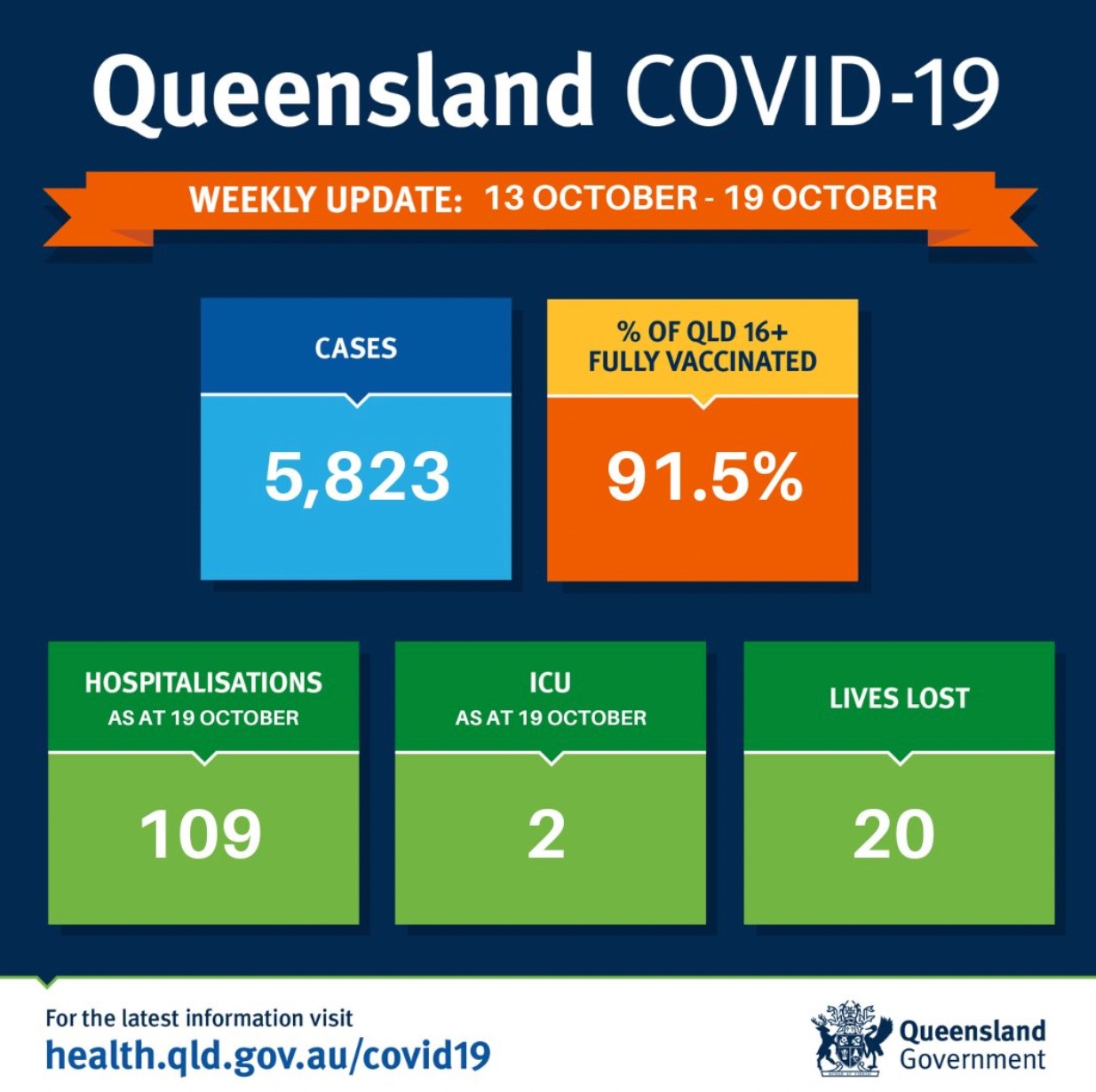 过去一周,昆州新增5823例,20人死亡。 共有109人因covid住院,2人住在重症监护室。 全州16岁以上人群两针接种率为91.5%。 图文来源:qldhealth 原文链接: